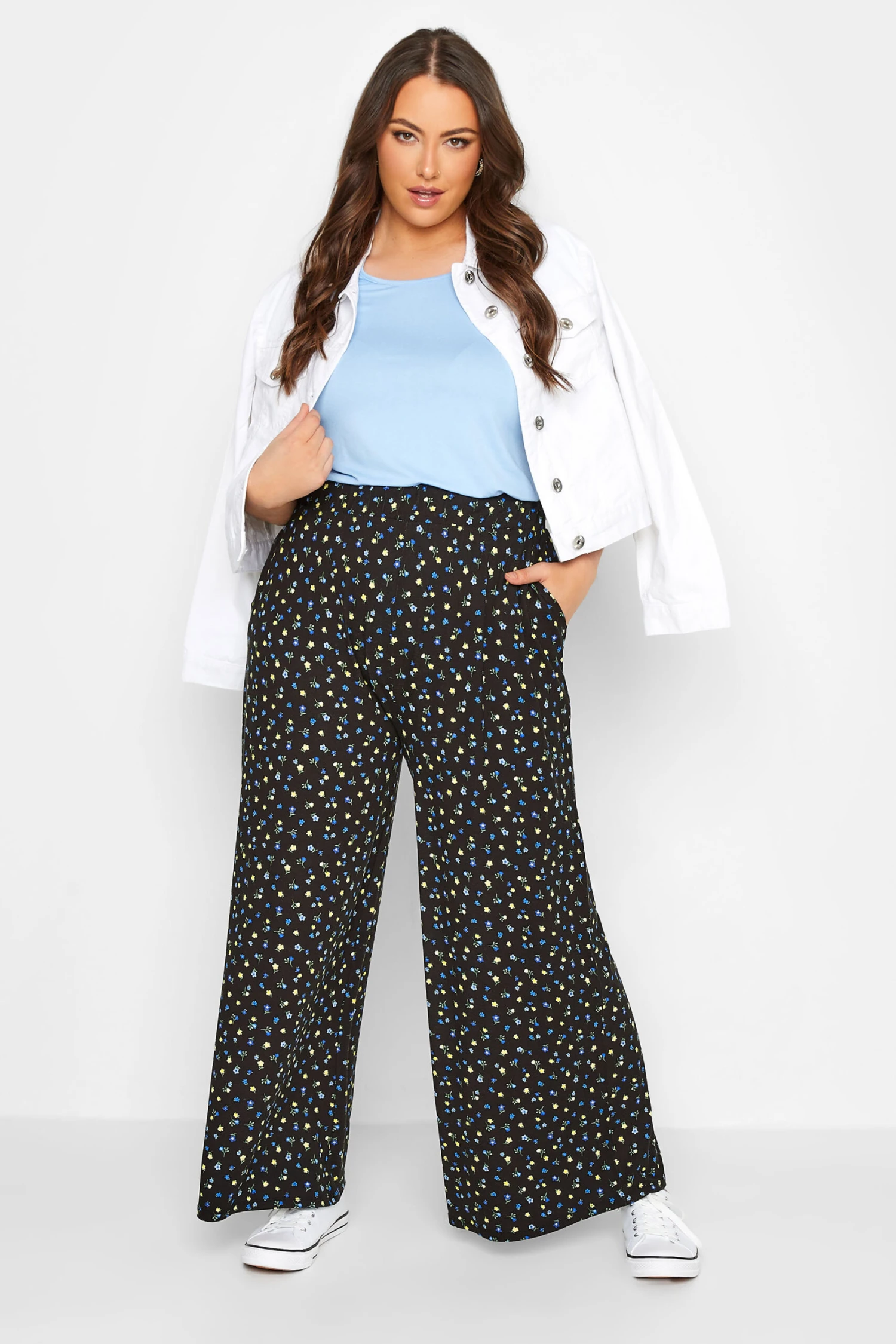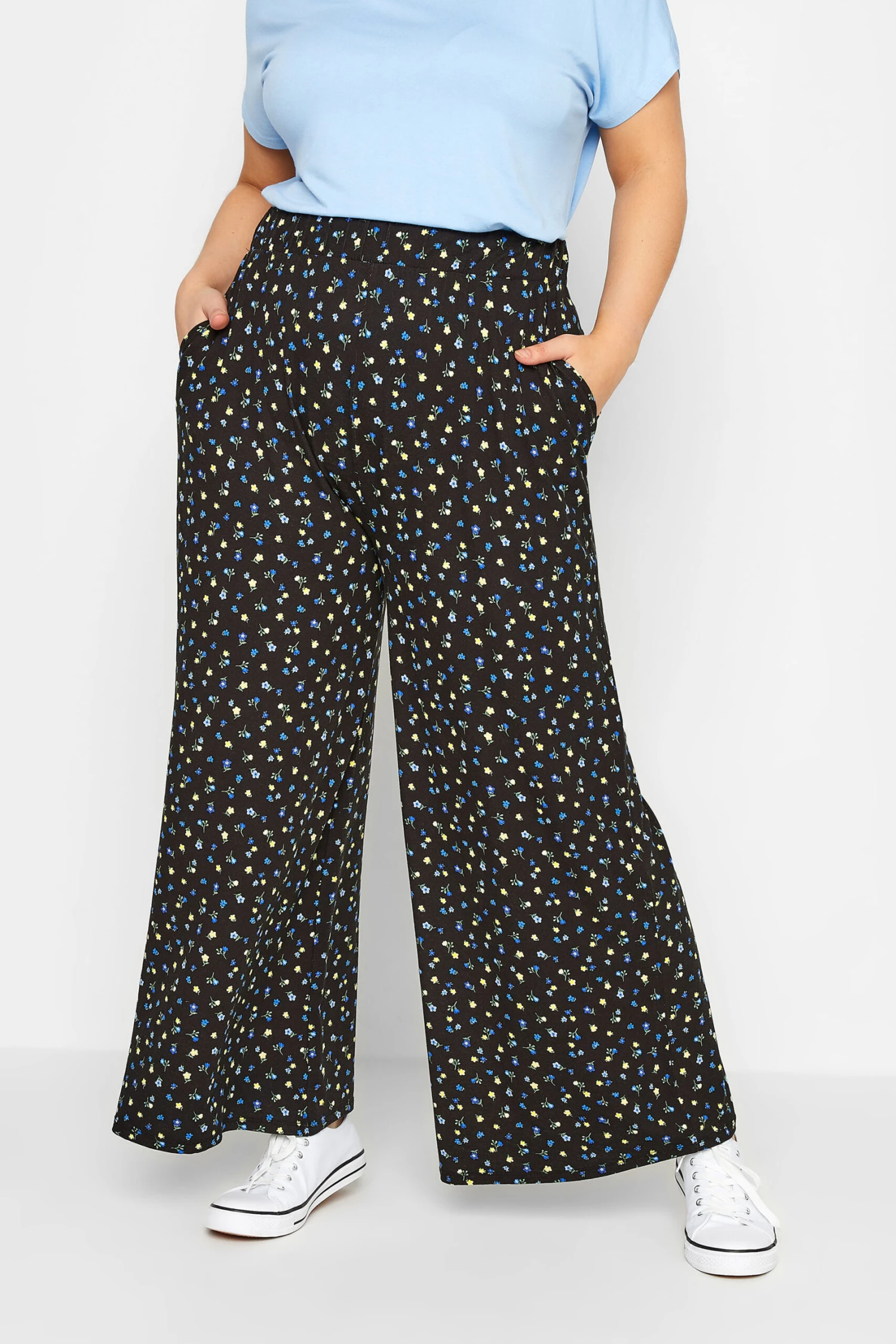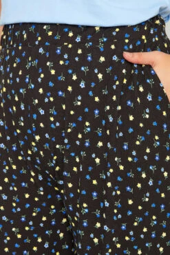 Craquez pour notre pantalon noir wide leg floral bleu et jaune à poches. Féminin et confortable, vous pourrez le porter en plusieurs styles.